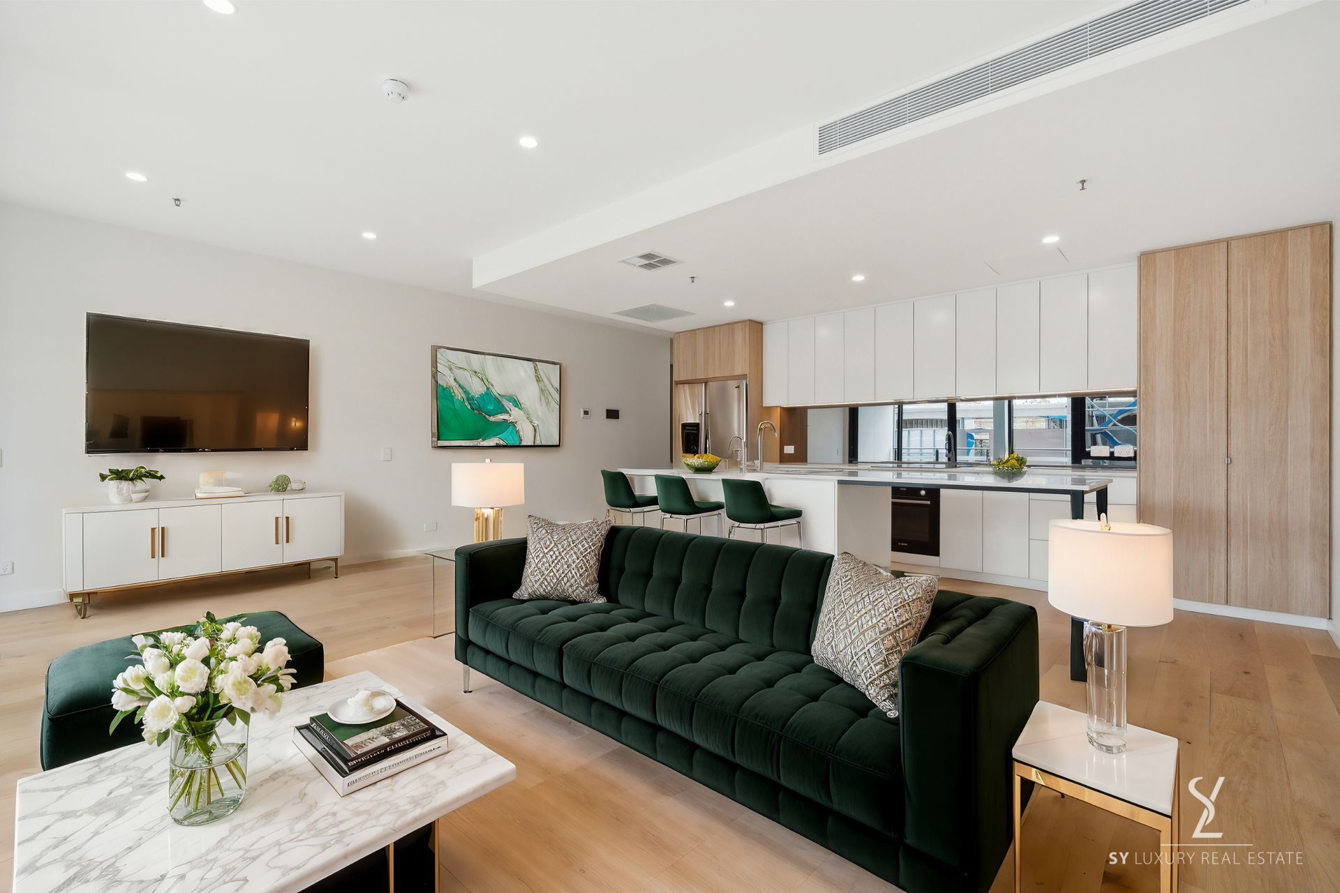 Featuring top-of-the-line European appliances and sleek solid stone countertops, the opulent kitchen, with commanding view over the expansive open-plan living area and generously proportioned north-facing balcony, stands as the quintessential domain for culinary buffs eager to entertain and build valuable memories with friends and family alike.