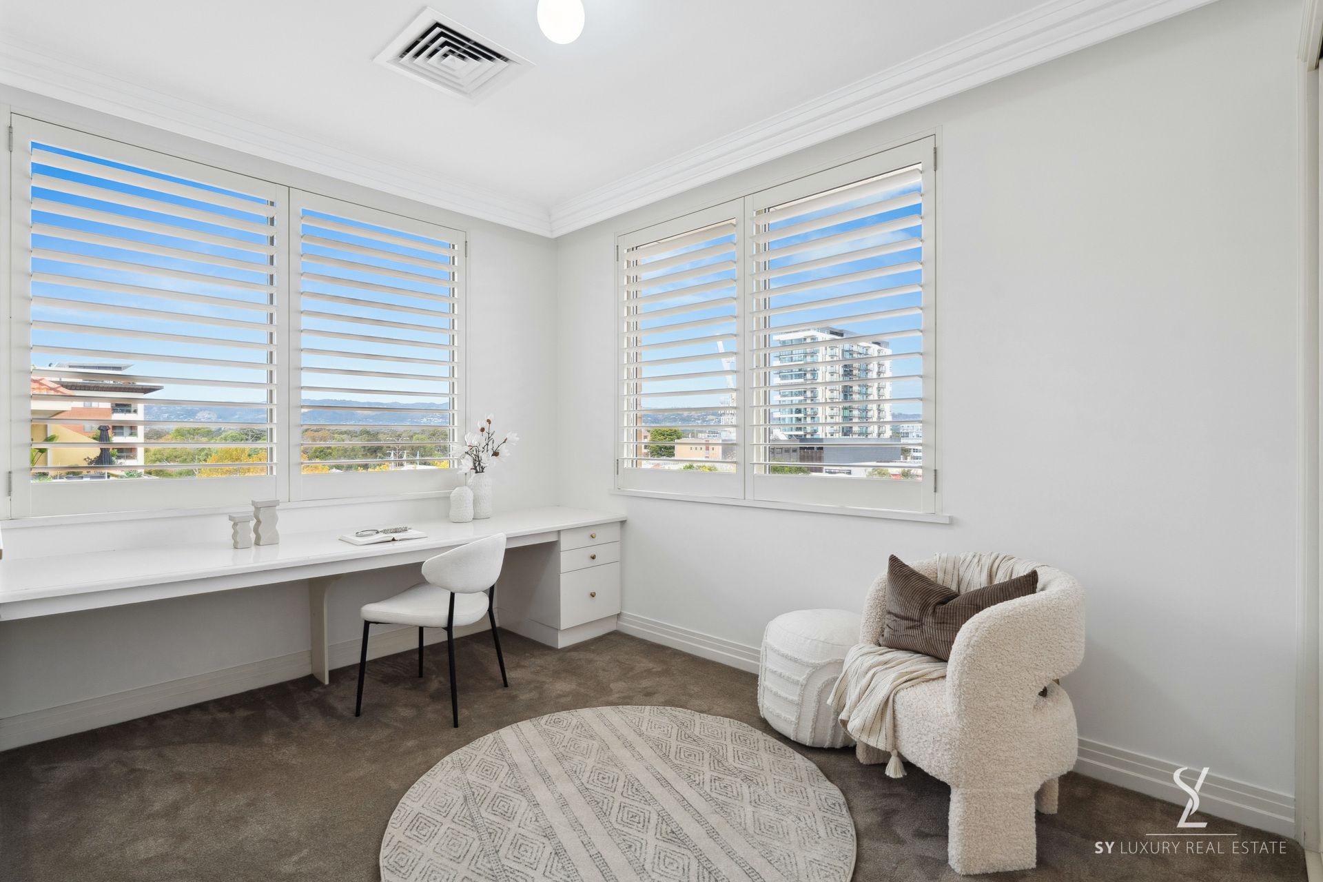 The fourth bedroom/office includes stylish plantation shutters and inbuilt desk and joinery, complete with a picturesque outlook.