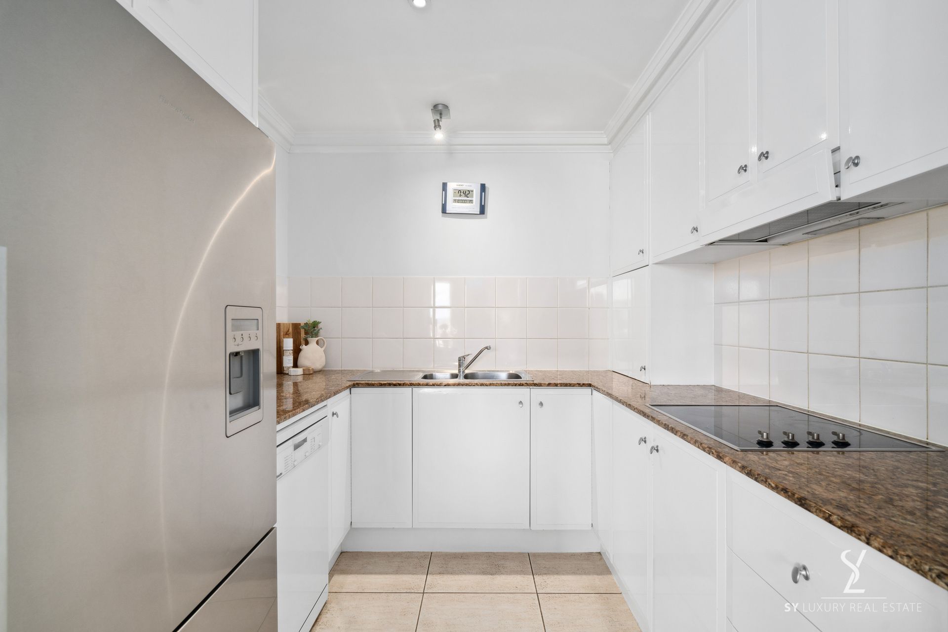 The tastefully designed kitchen, complete with quality stainless steel appliances and elegant polished stone countertops, exudes both functionality and sophistication, enhancing the apartment's timeless charm and practicality.