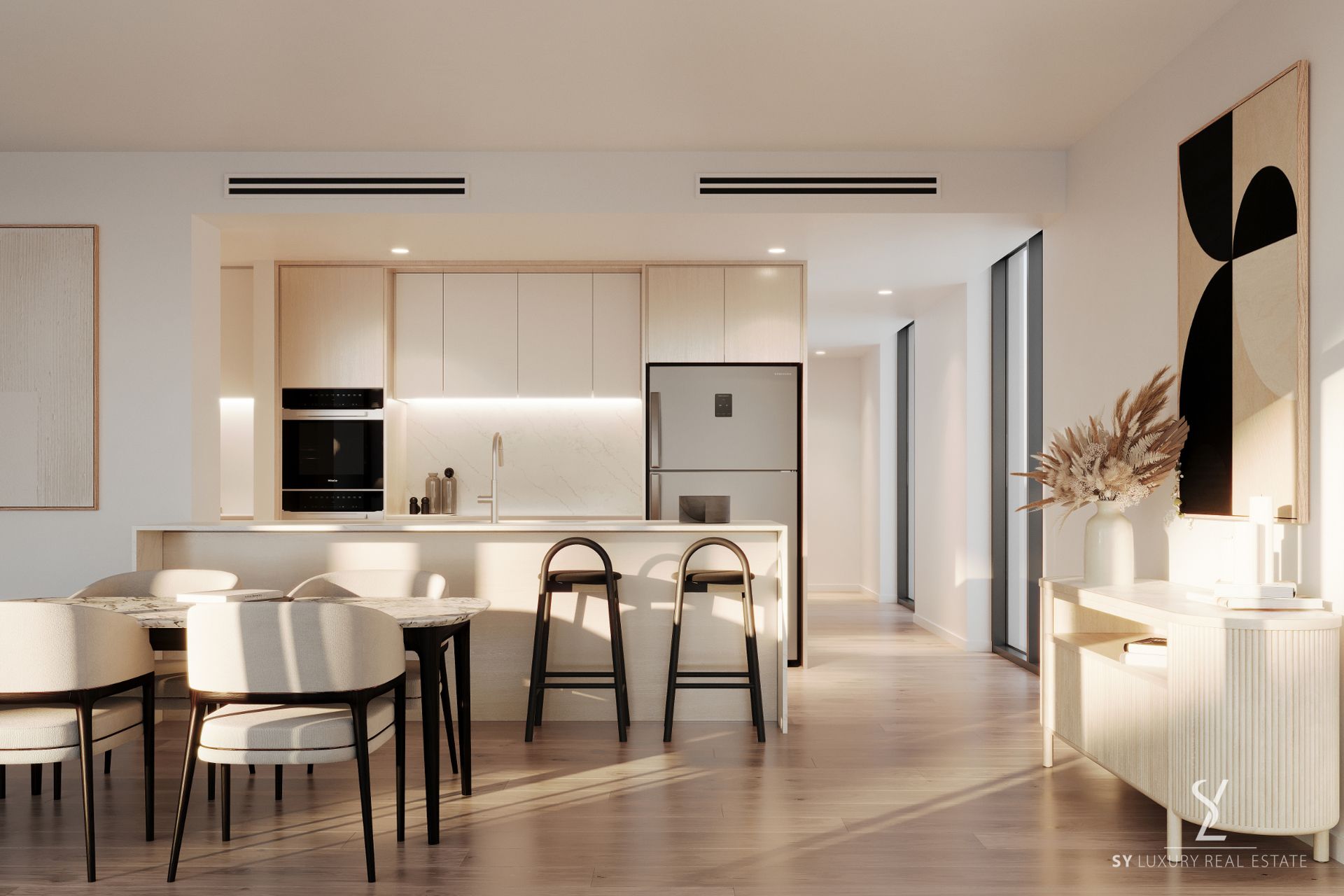The open-plan kitchen, dining and living area is designed to be the heart of the home. Picture hosting friends in a space that flows effortlessly from the kitchen, complete with premium stone benchtops, high-end Miele appliances and a spacious butler's pantry, to the warm living and dining spaces adorned with oak flooring. Expansive glazing floods the room with natural light and connects seamlessly to a private balcony where city views provide an ever-changing backdrop.