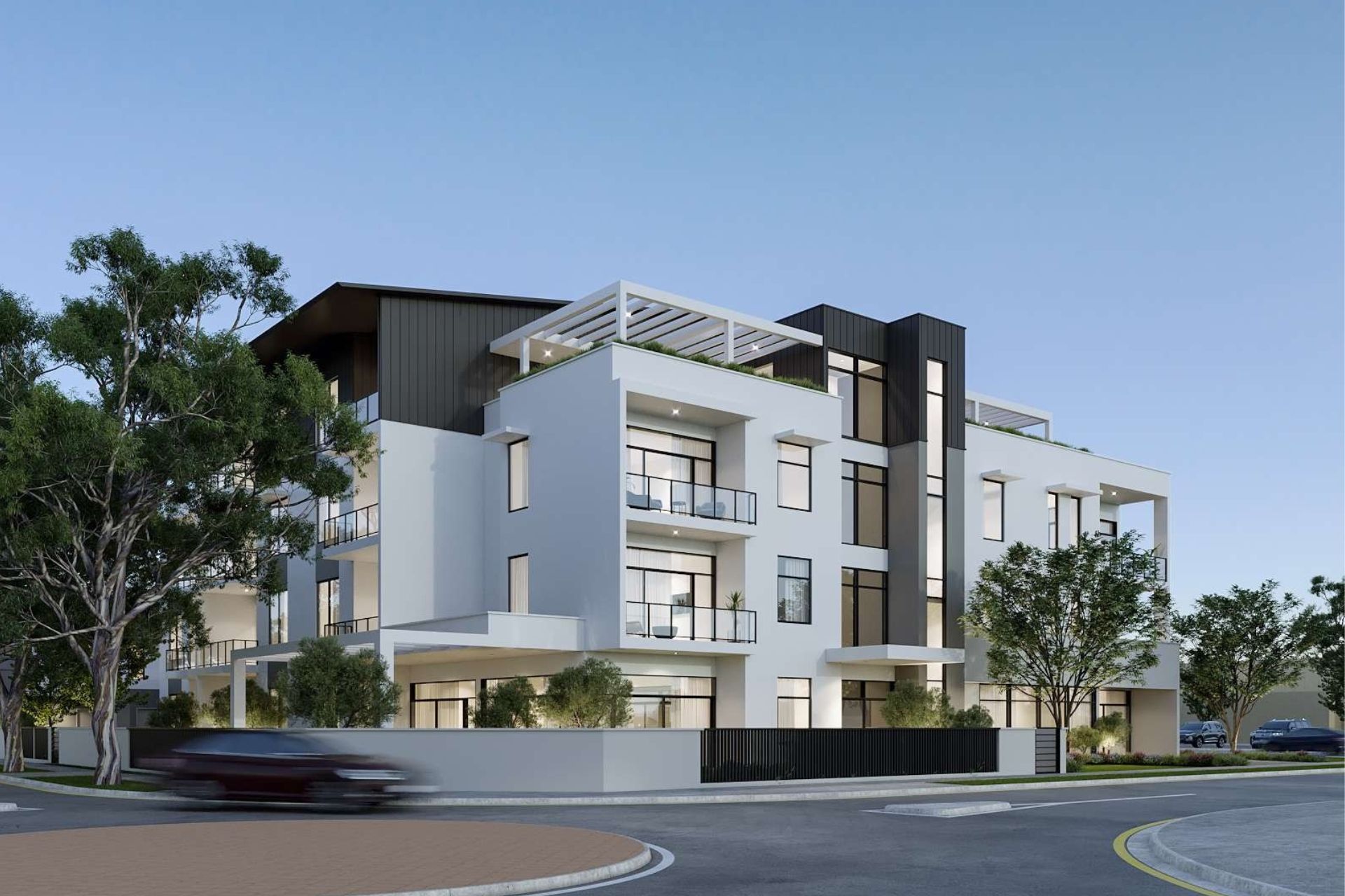 The apartment configuration ensures natural light and cross ventilation with its north-facing, single-aspect design across three street frontages: Gray Street, First Avenue and ROW. Purposefully articulated to break up bulk and deliver visual interest, the building's form is both contemporary and sympathetic to its evolving streetscape, enhanced by established pine trees and carefully integrated landscaping.